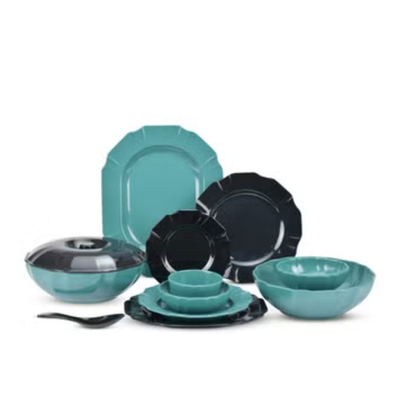 طقم ميلامين دايموند الفاخر بتصميم عصري وألوان أنيقة بالأسود والتركواز و الأسود و الزيتي ، مصنوع من خامة ميلامين قوية ومقاومة للكسر ليستحمل الاستخدام اليومي. مثالي لتقديم الطعام في المناسبات والضيافة والعائلة، مع سهولة في التنظيف وخفة في الوزن ليمنحك تجربة عملية وأنيقة على سفرتك.