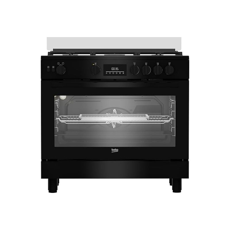 البوتاجاز: 5 شعلات غاز، فرن كبير سعة 97 لتر، شواية غاز بمساعدة المروحة، إشعال ذاتي، مروحة تبريد، شاشة LED للتحكم باللمس، تصميم أسود عصري، أبعاد 90×60×90 سم، أمان كامل للشعلات والفرن.