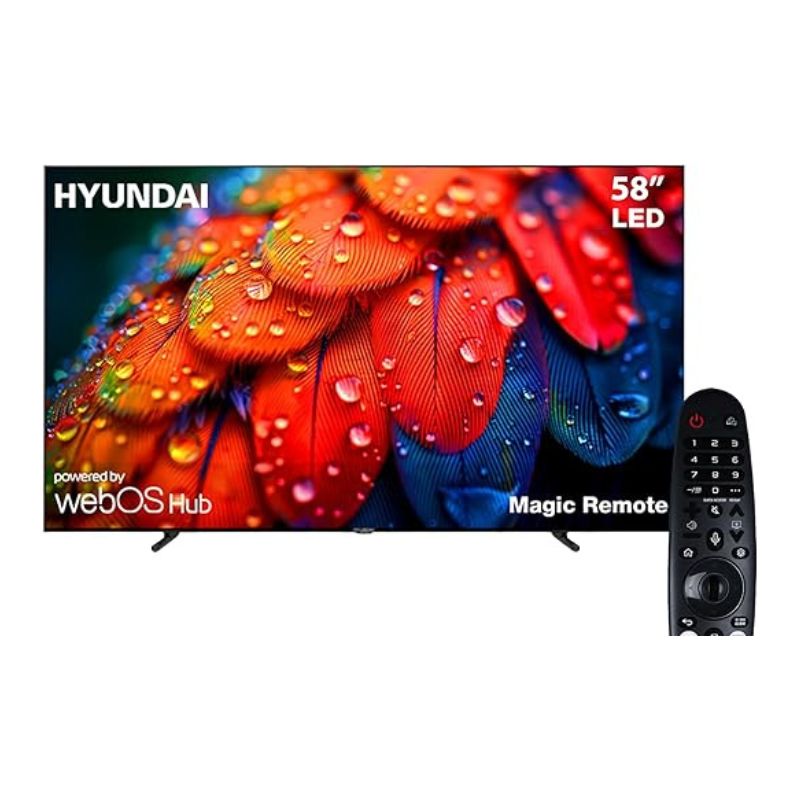 استمتع بتجربة مشاهدة سينمائية مذهلة مع تلفزيون هيونداي الذكي 58 بوصة بدقة 4K UHD، مزود بنظام WebOS، تصميم Frameless بدون إطار، ريسيفر مدمج، ريموت ماجيك، مع جودة صورة فائقة ولوحة A+ وسطوع قوي لتجربة مشاهدة غامرة في المنزل.