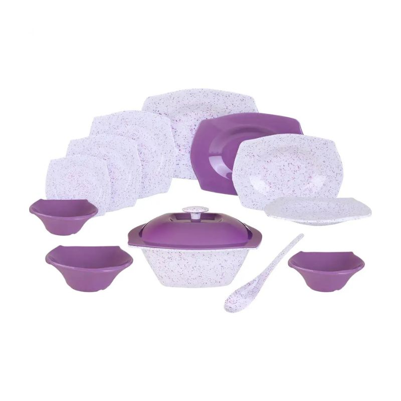 طقم عشاء متكامل من ميلامين عالي الجودة، مقاوم للكسر وآمن للاستخدام في الميكروويف وغسالة الأطباق، مثالي لجميع مناسبات العائلة.
